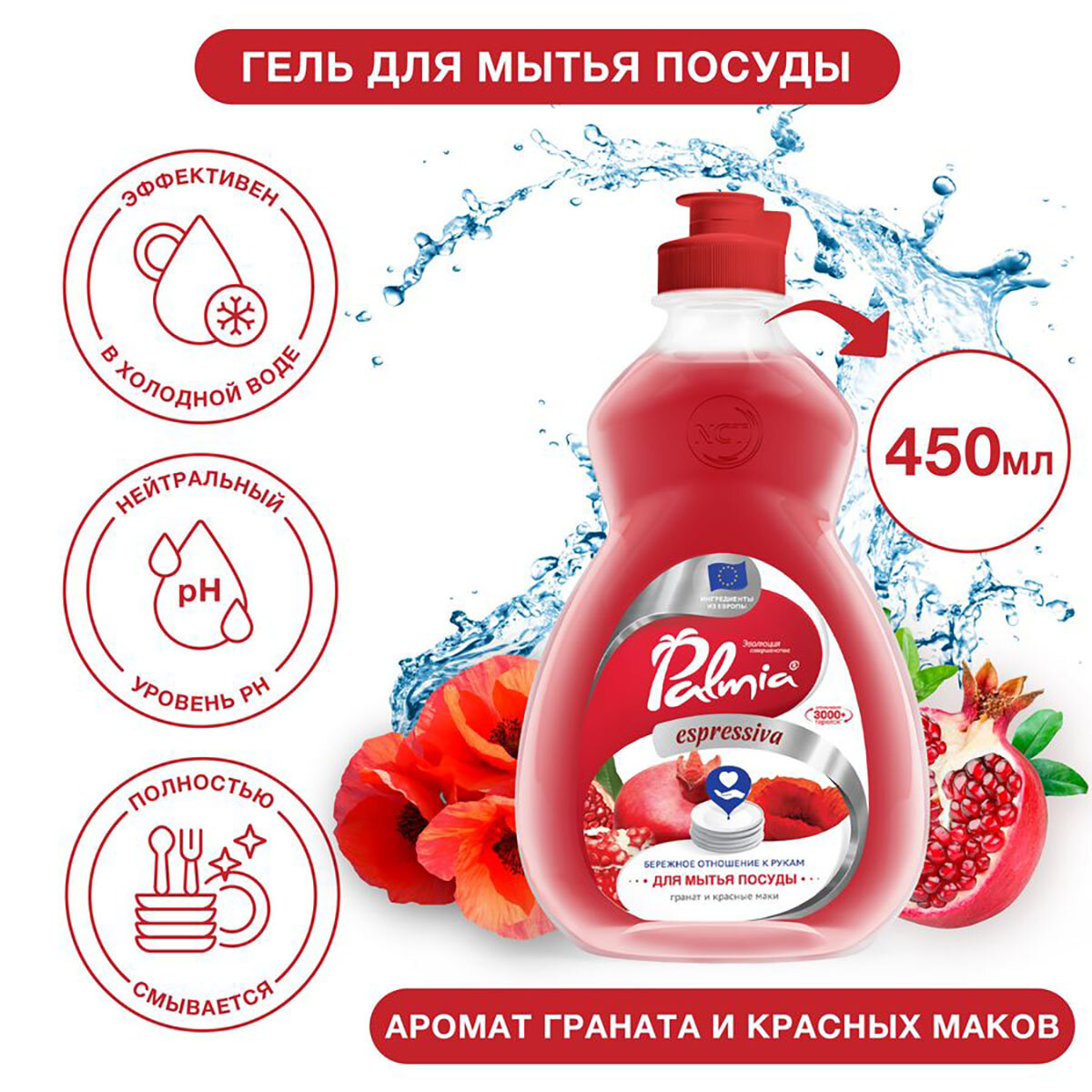 Гель для мытья посуды Palmia "Espressiva" с ароматом граната и красных маков, 0,5 л, с дозатором