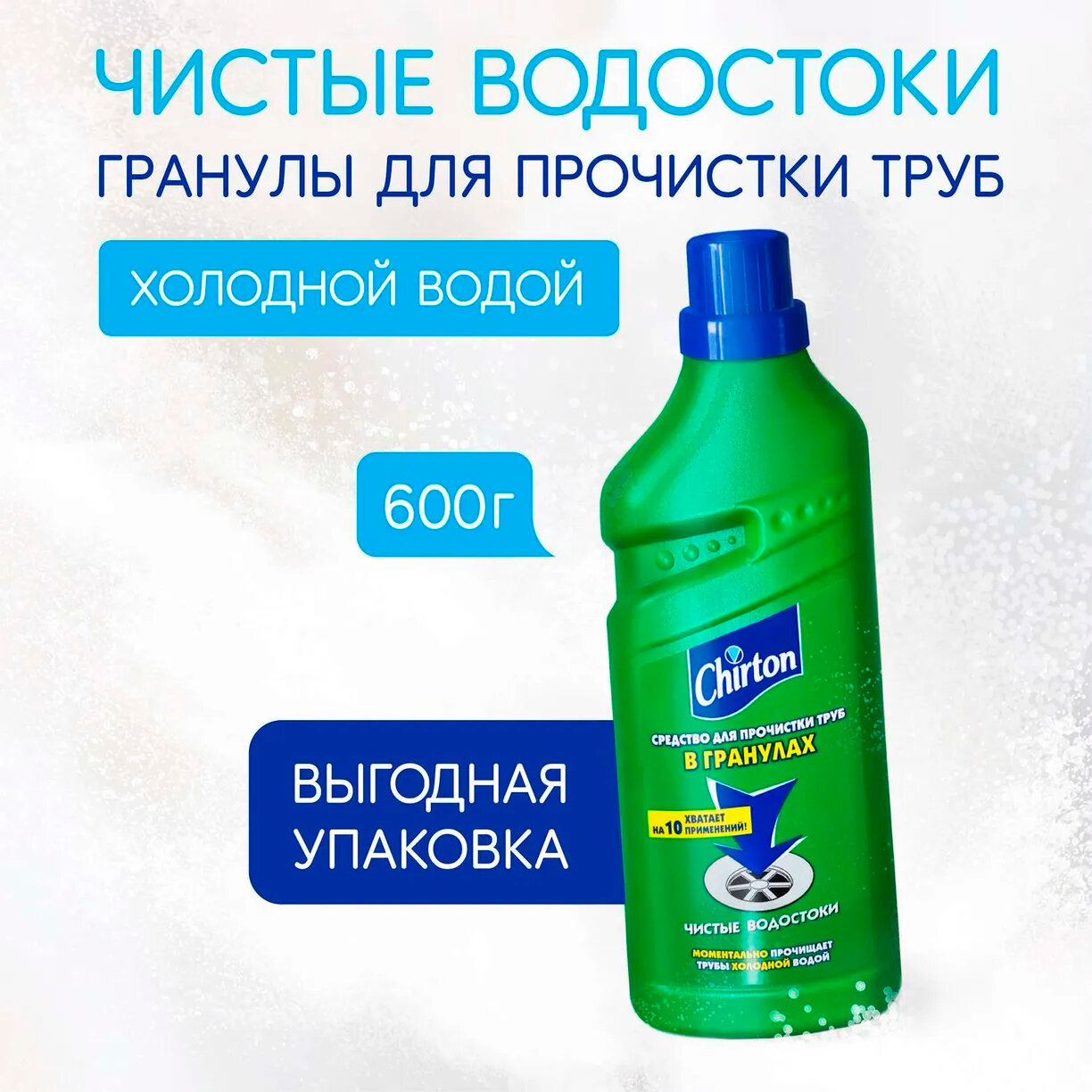 Chirton Средство для прочистки труб холодной водой в гранулах Chirton, в пластиковой бутылке, 600 г