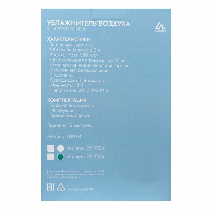Luazon Home Увлажнитель воздуха Luazon LHU-04, ультразвуковой, 18 Вт, 2 л, 35 м2, бело-голубой