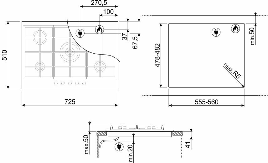 Встраиваемая газовая панель SMEG/ Газ, Classica,газовая варочная панель, 72,5 см,нержавеющая сталь