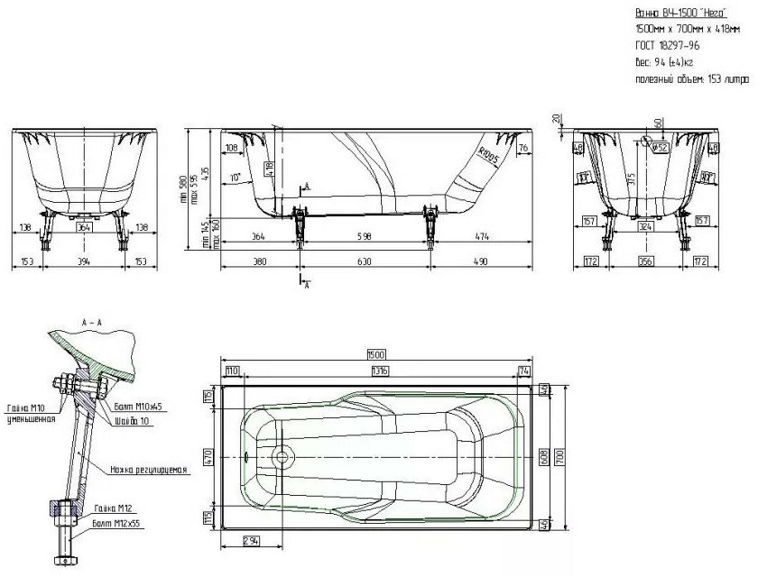 Ванна чугунная Универсал Нега 150x70 с ручками интересное: