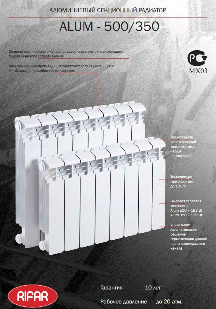Алюминиевый радиатор Rifar (Рифар) Alum 500 6 сек. (Кол-во секций: 6; Мощность, Вт: 1098)