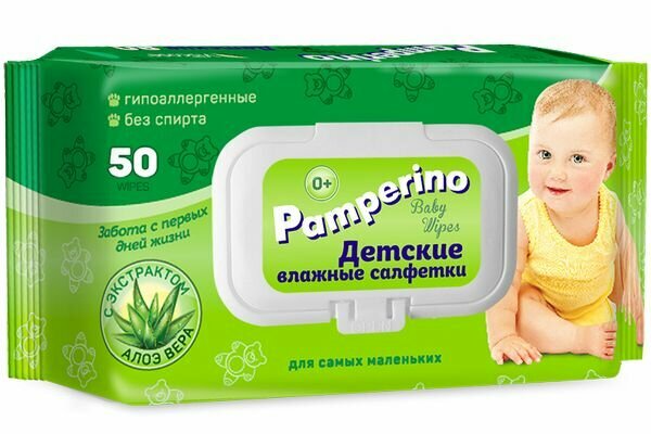Влажные салфетки Pamperino Детские с экстрактом алоэ вера, пластиковая крышка, 50 шт.