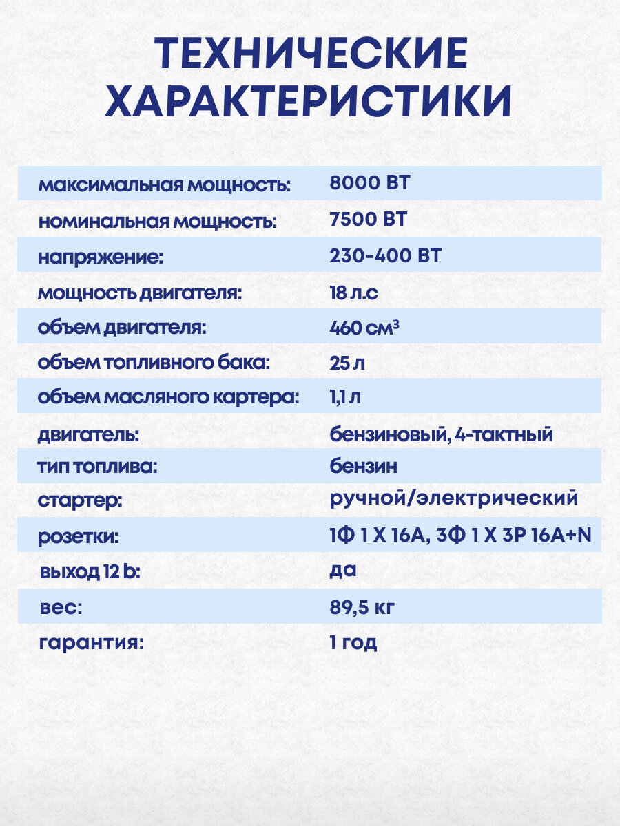 | Номинальная мощность | 7500 Вт |