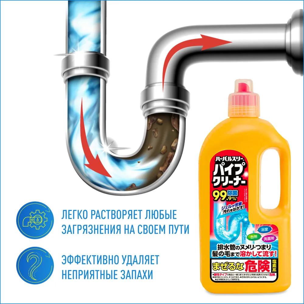 Очиститель для труб от засоров Mitsuei 0.8 л, Япония / Гель для удаления засоров, очиститель канализационых и сливных труб в ванной и на кухне / Антибактериальное средство