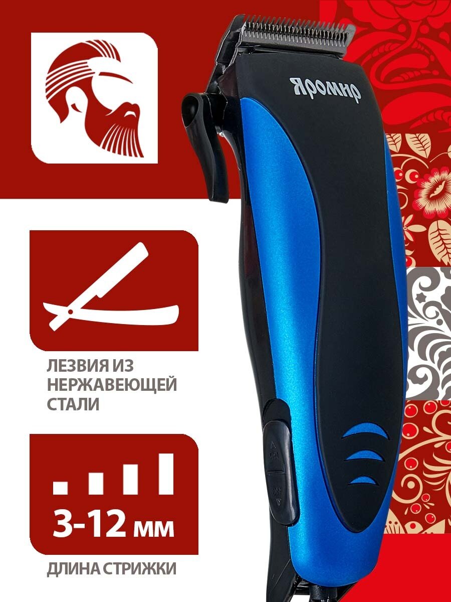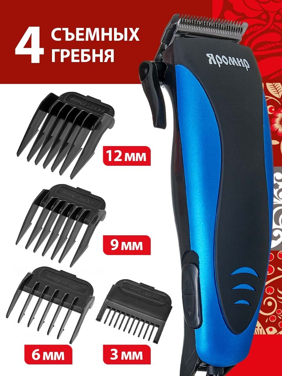 Машинка для стрижки яромир ЯР-704 черный с синим, 10Вт, 4 съемных гребня