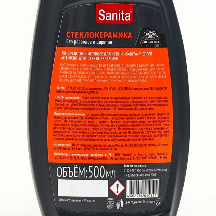SANITA спрей Антижир для стеклокерамики, 500 мл (версия 2022)