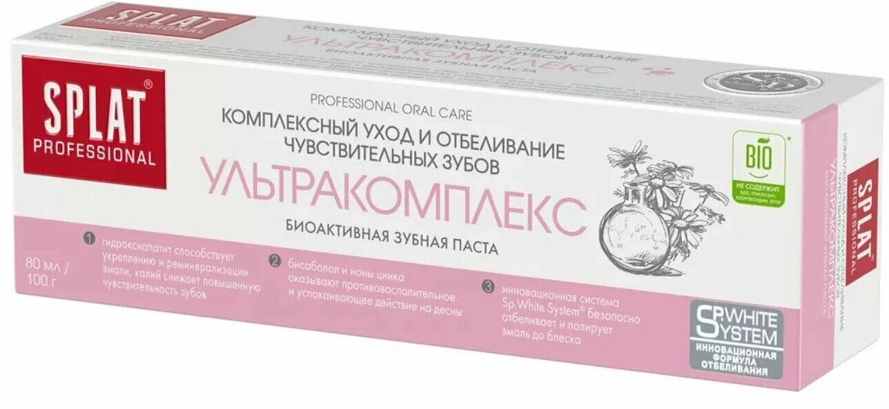 Зубная паста отбеливающая SPLAT Professional Ультракомплекс для чувствительных зубов, комплексный уход за полостью рта, 100 мл
