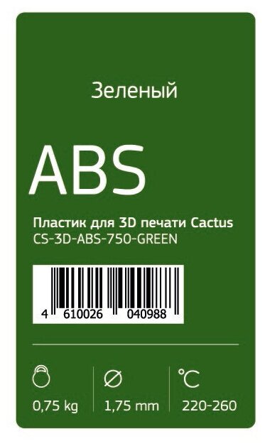 Купить Пластик для принтера 3D Cactus CS-3D-ABS-750-GREEN ABS, диаметр 1.75 мм, 0.75 кг, 1 цвет