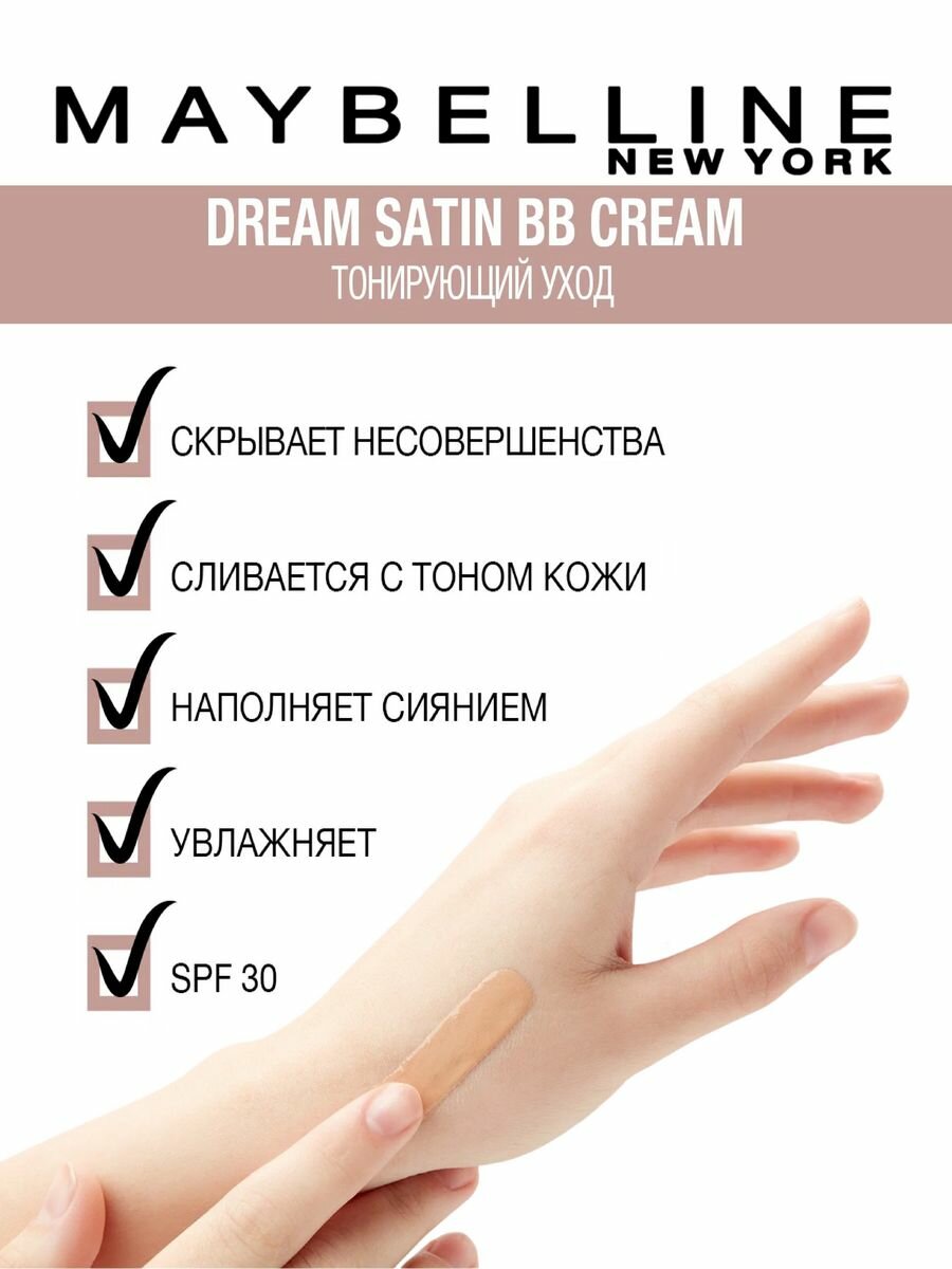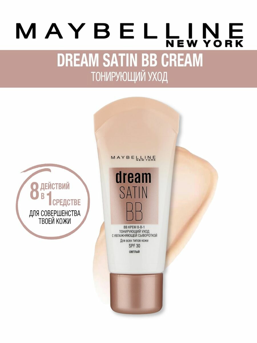 Maybelline New York Dream Satin BB-крем 8 в 1 Тонирующий уход с увлажняющей сывороткой SPF 30, оттенок Очень Светлый, 30 мл