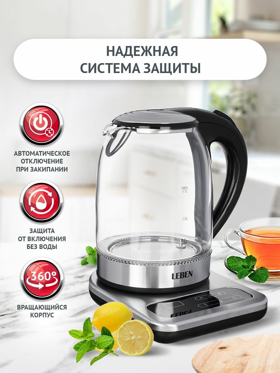 LEBEN Чайник электрический 1,7л, 1850Вт, скрытый нагр. элемент, стекло с поддержанием темп.
