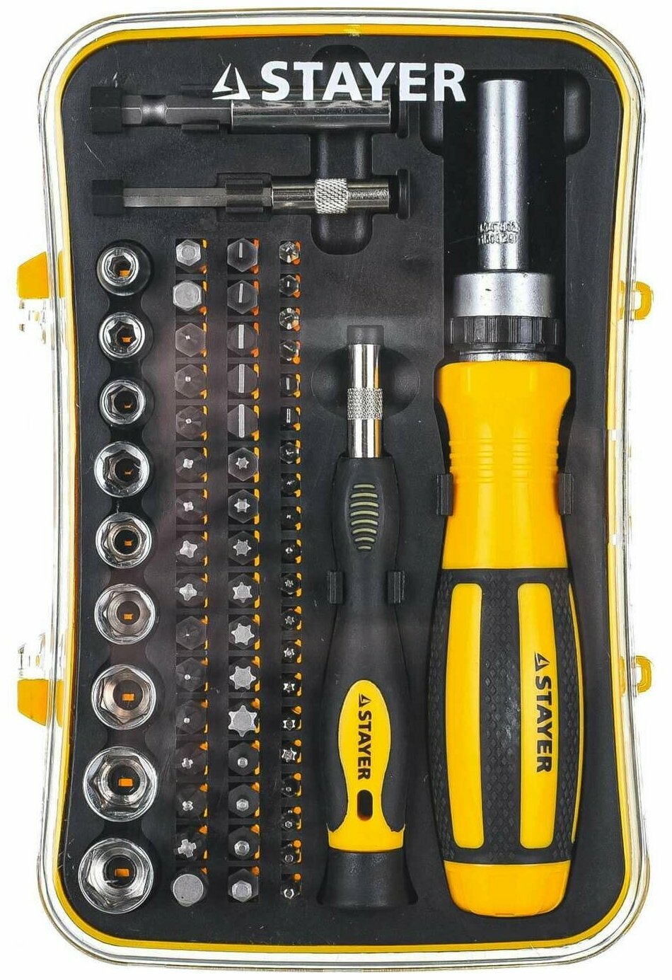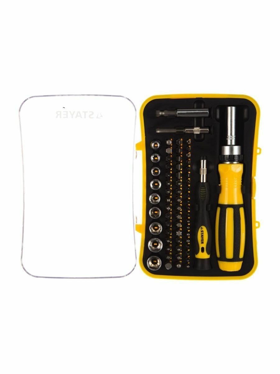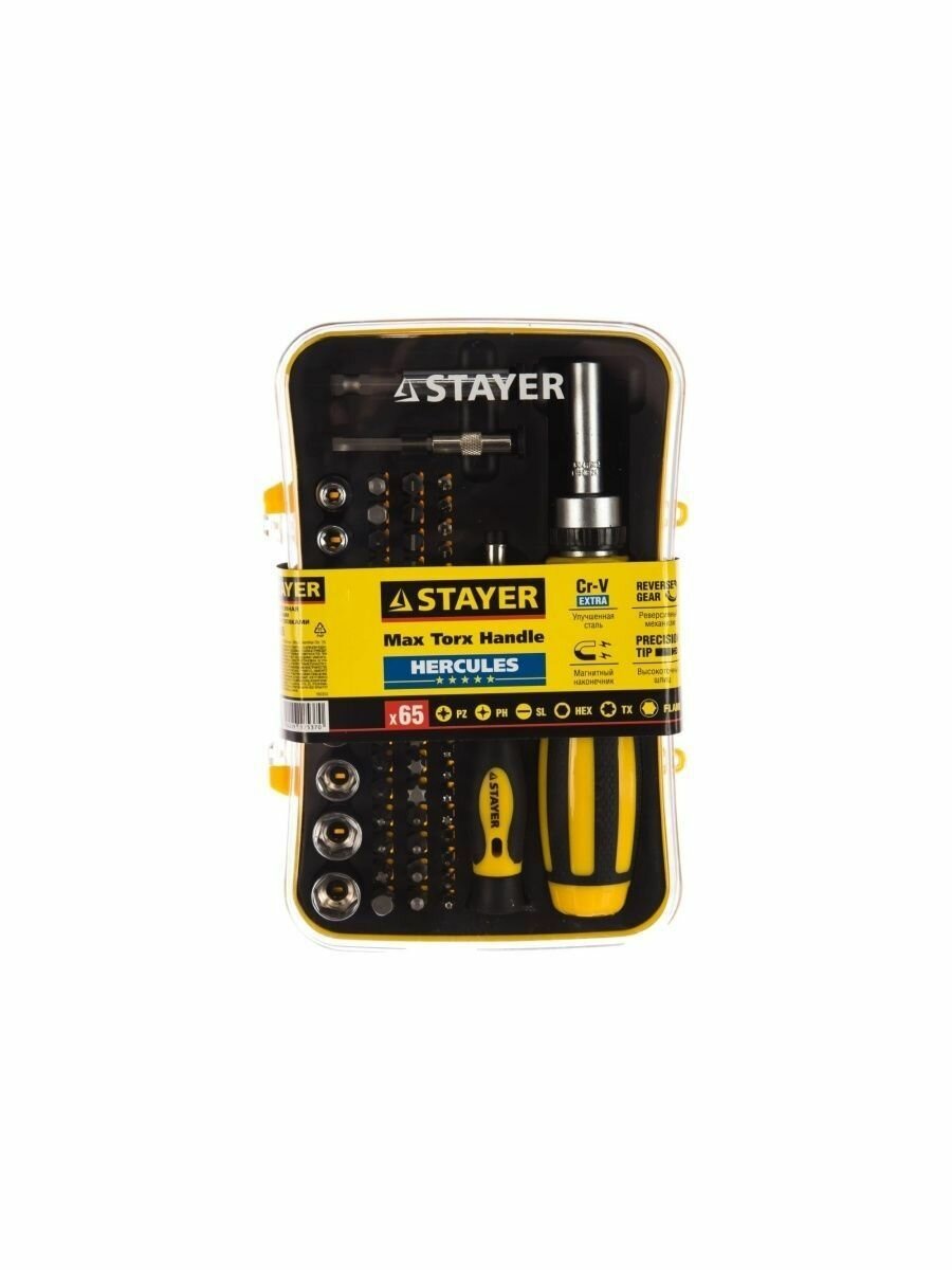STAYER 65 шт., отвертка реверсивная в наборе с битами и торцевыми головками 25310-H65