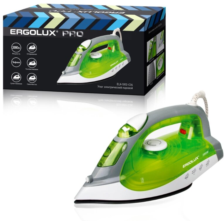 Ниже Вы можете прочитать отзывы на Утюг 2000Вт тефлон, салатовый, паровой электр., 220-240В, ERGOLUX ELX-SI02-C34, ознакомится с подробными характеристиками, посмотреть интересные обзоры и фотографии на Утюг 2000Вт тефлон, салатовый, паровой электр., 220-240В, ERGOLUX ELX-SI02-C34.