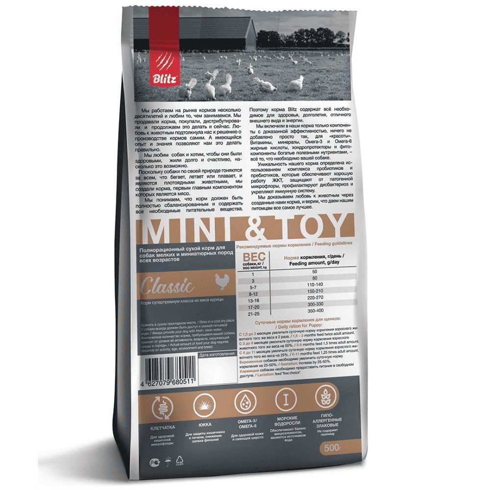 Корм сухой BLITZ Classic Mini & Toy Breeds Dog All Life Stages 0,5 кг для собак миниатюрных и мелких пород (курица)