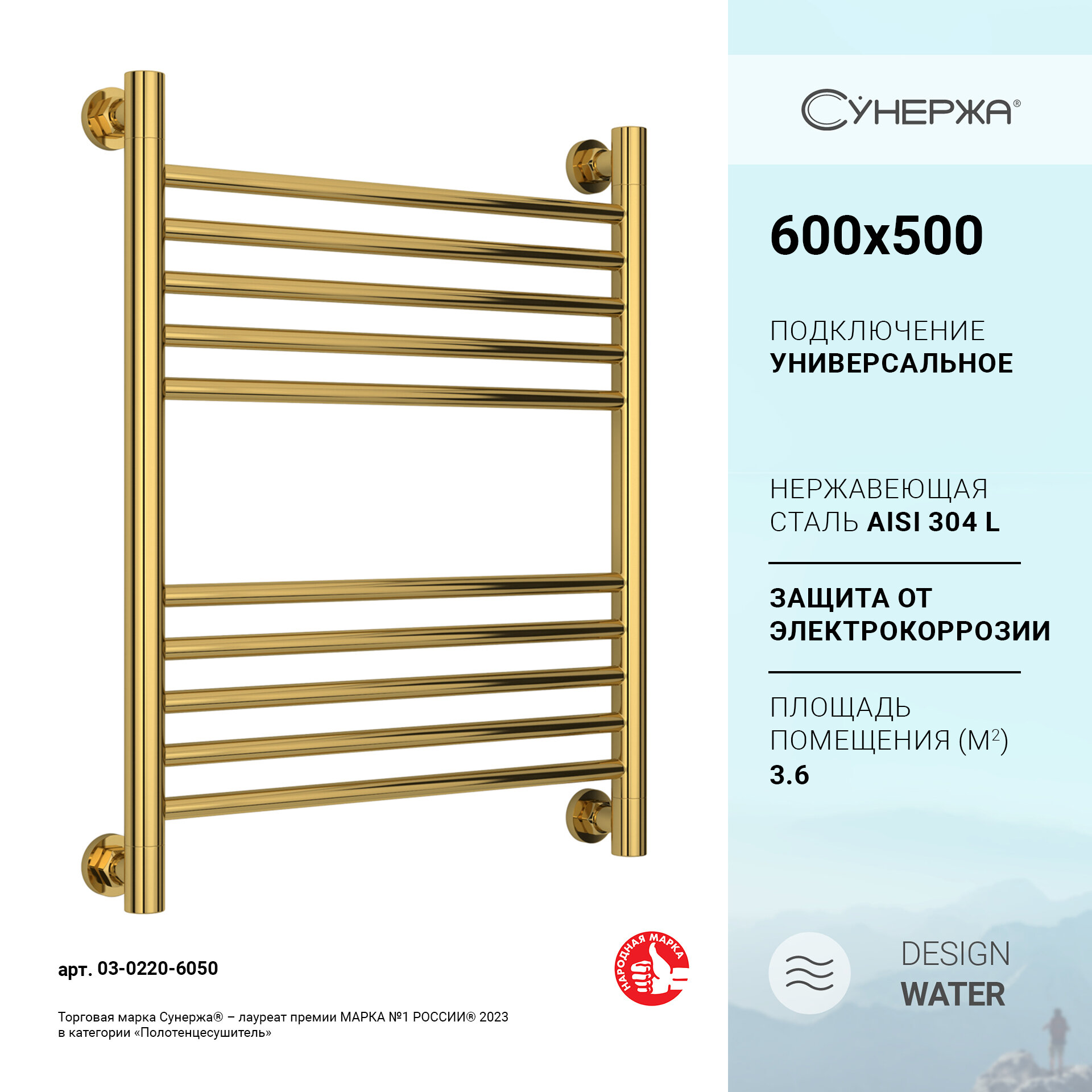 Купить Водяной полотенцесушитель Сунержа Богема+ прямая 600x500 золото