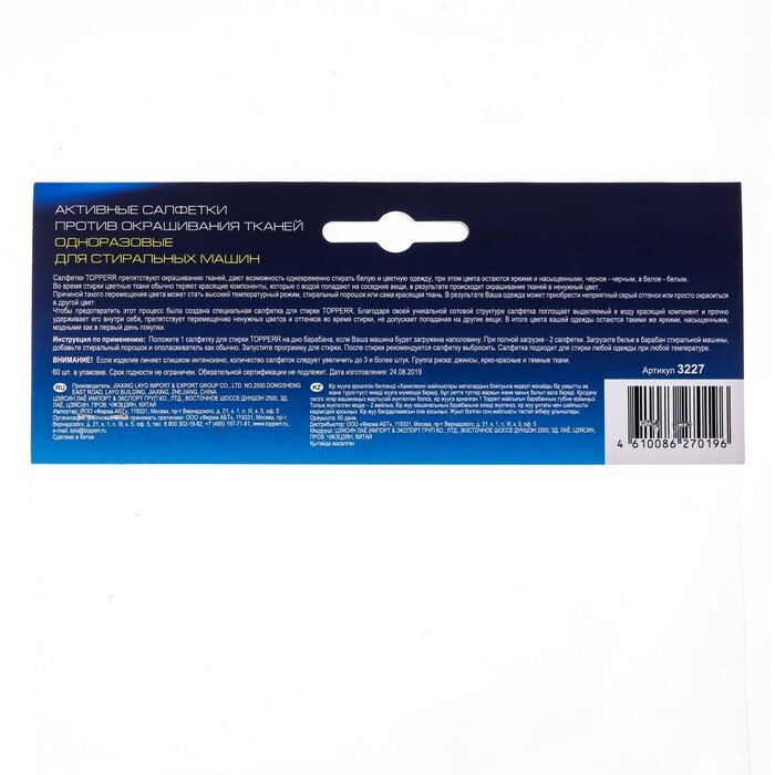 Салфетки для стирки тканей разных цветов 60 шт, "Topperr"