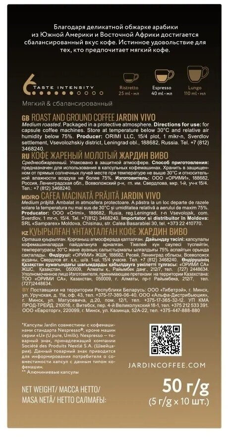 Кофе в капсулах молотый Jardin Vivo средняя обжарка, для системы Nespresso, 10 ш