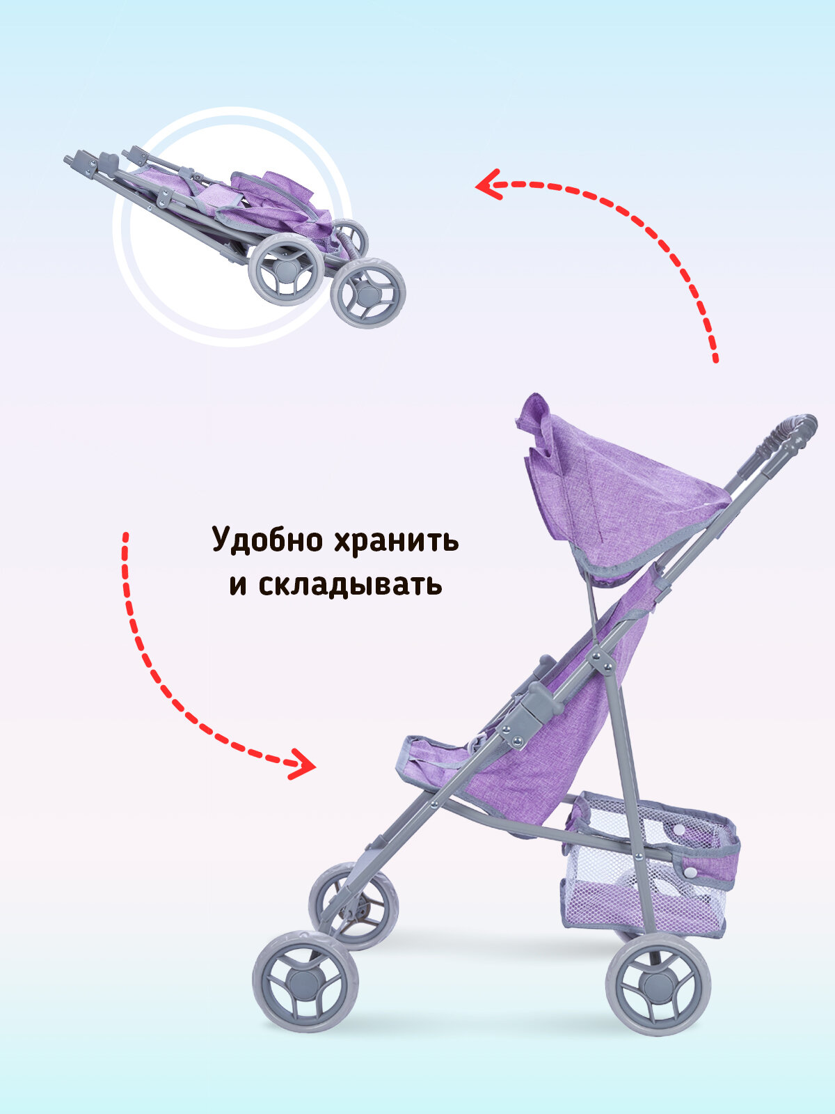 Коляска для кукол, с крышей, ремешками для фиксирования куклы, корзиной, в пакете