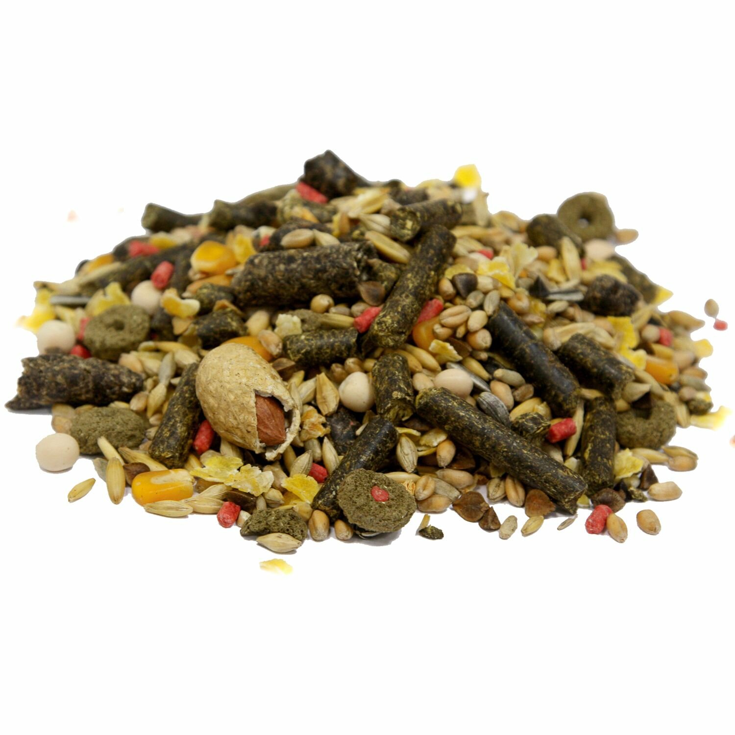 | Плюсы: | Обычный корм с прессованными цилиндрами травы, арахисом в кожуре и зерном. |