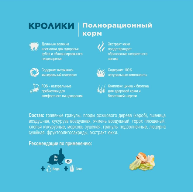 | Плюсы: | Состав, кролик ест с удовольствием |