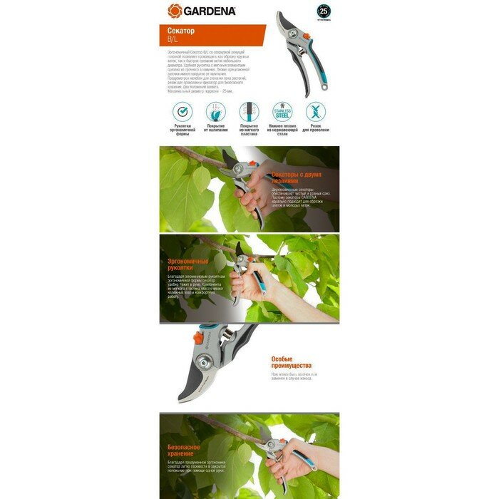 Ниже Вы можете прочитать отзывы на Секатор Gardena B/L, ознакомится с подробными характеристиками, посмотреть интересные обзоры и фотографии на Секатор Gardena B/L.