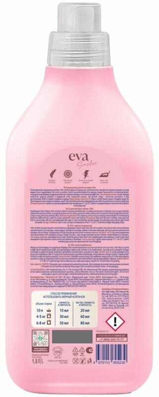 | Плюсы: | Самый лучший кондиционер для белья. Раньше пользовалась только Vernel. но он давно перестал справляться с функцией кондиционер. когда купила Eva, он удивил. белье все пахнет, нежный запах не потерялся даже на улице, белье мягкое, полотенца нежные |