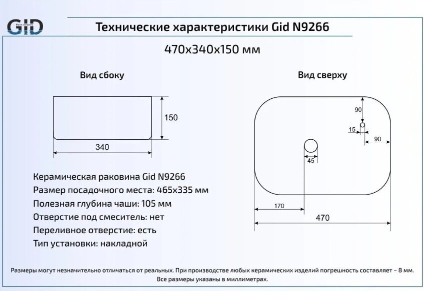 Раковина накладная (47х34) Gid N9266 интересное: