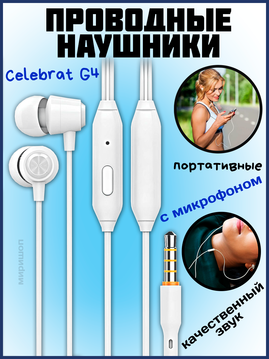 Наушники Celebrat G4, mini jack 3.5 mm, white