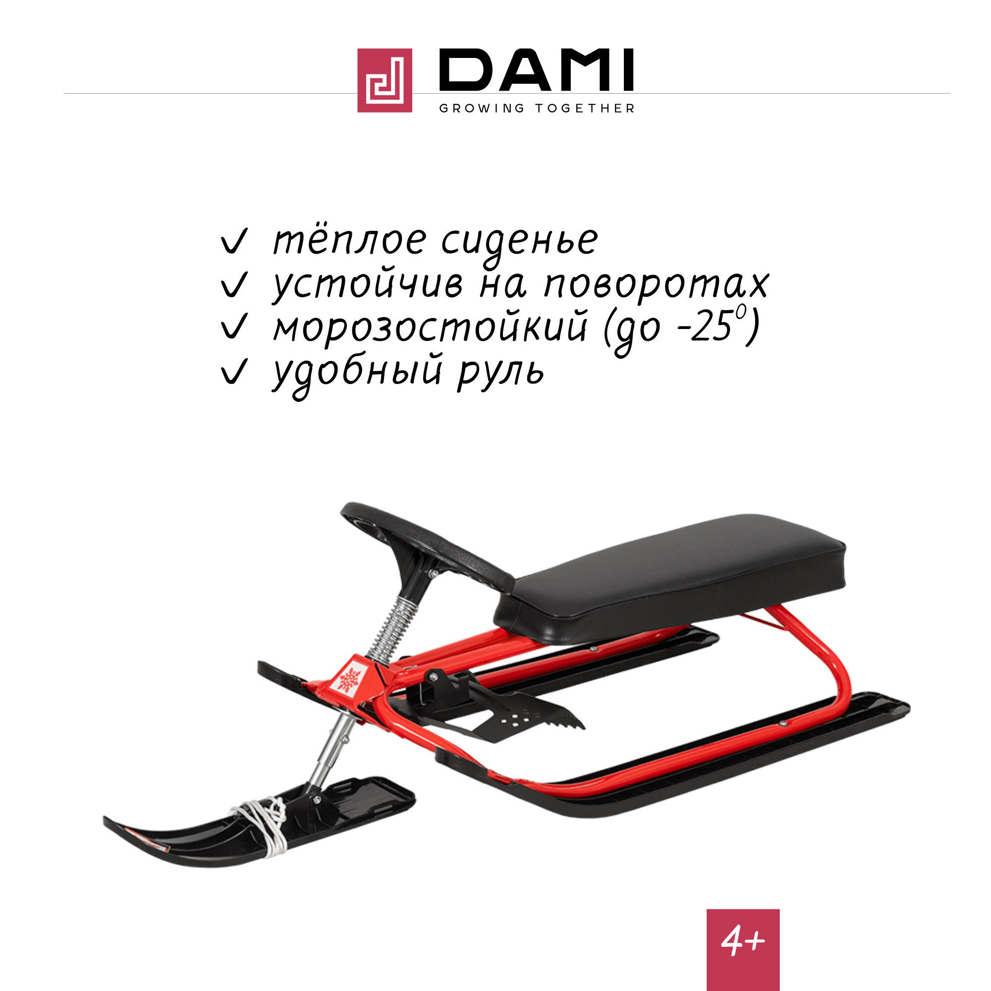 Снегокат DAMI / Дэми детский с безопасным управлением, мягкое сиденье для двоих, нагрузка до 120 кг, Комфорт, красный