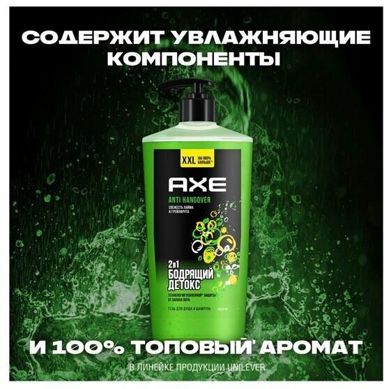 AXE 2в1 гель для душа и шампунь ANTI HANGOVER XXL, Грейпфрут и лайм, увлажнение и свежесть 610 мл