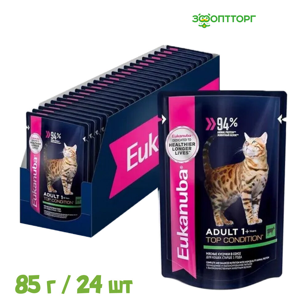 Корм для кошек Eukanuba Adult Top Condition влажный рацион с говядиной в соусе, 85гр. (24шт.)