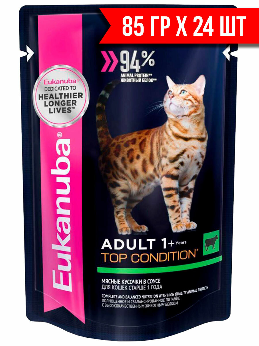 Влажный корм для кошек Eukanuba Top Condition, для здоровья кожи и блеска шерсти, с говядиной, 24 шт. х 85 г (кусочки в соусе)