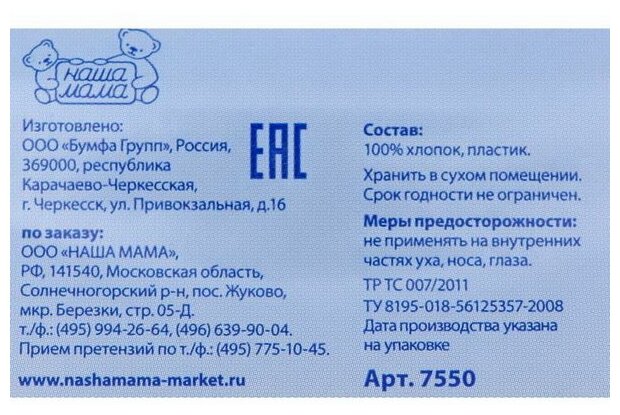 Детские специальные Ватные палочки "Наша мама", с ограничителем, 50 шт 1528487
