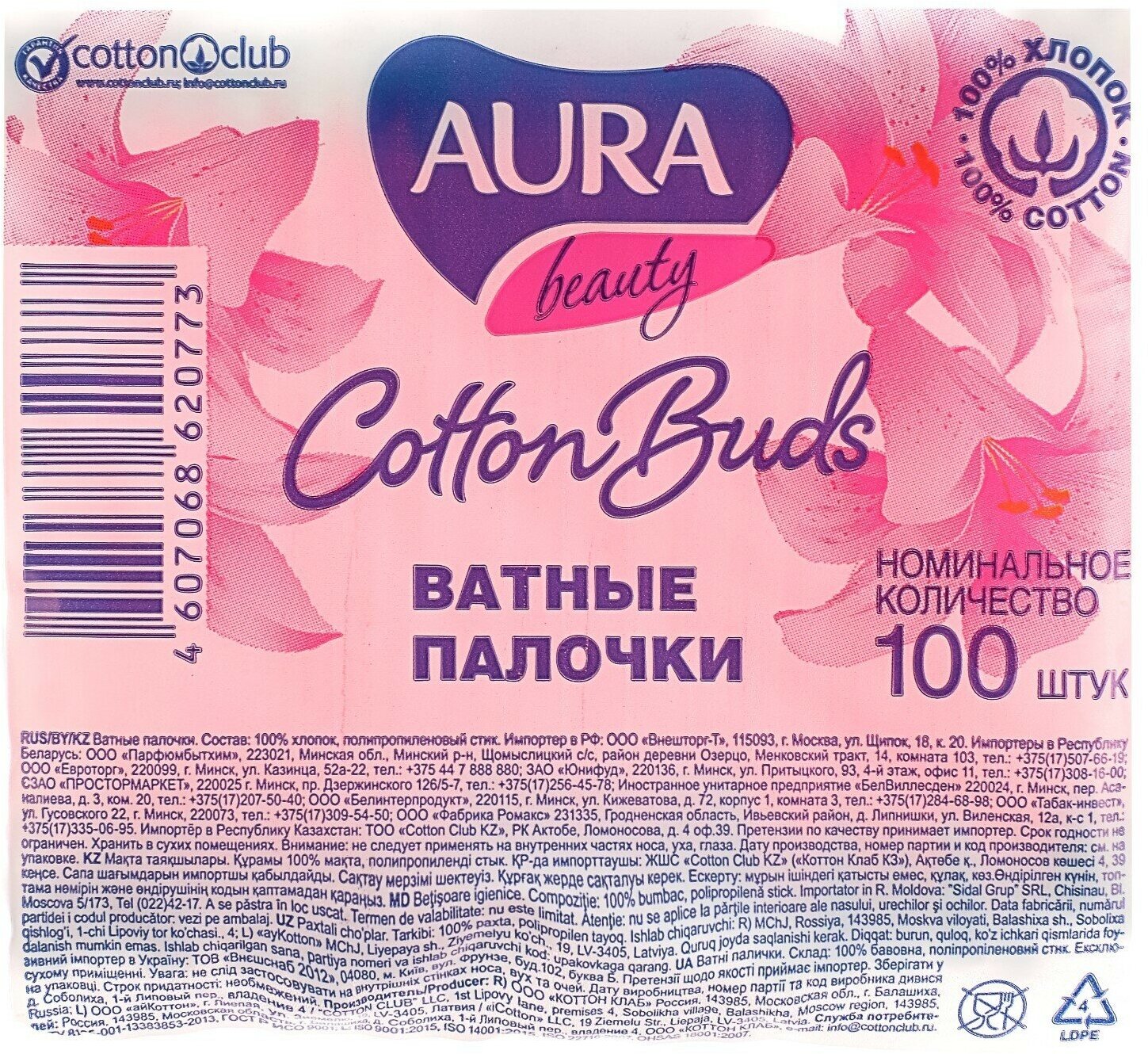AURA Beauty Ватные палочки п/э пакет 100 шт