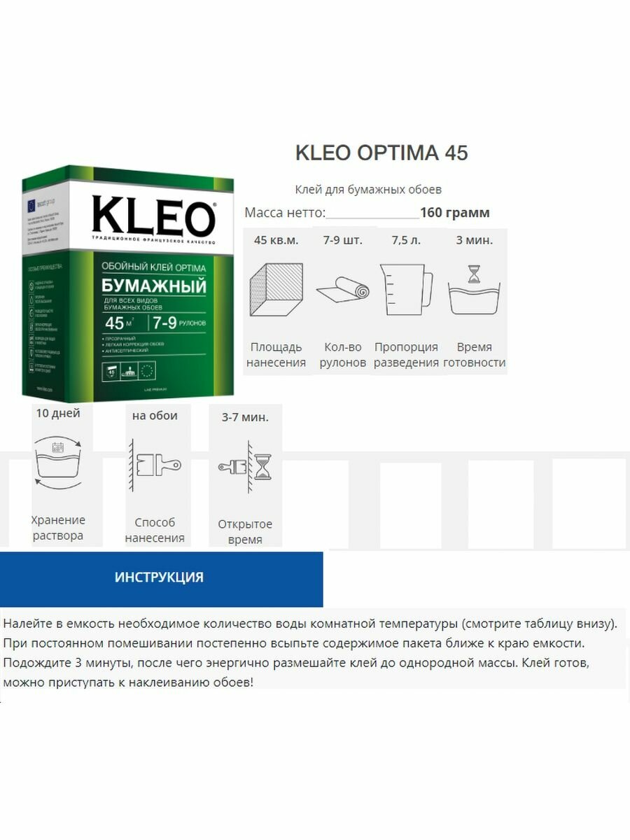 Клей для бумажных обоев KLEO OPTIMA Бумажный 0.16 кг
