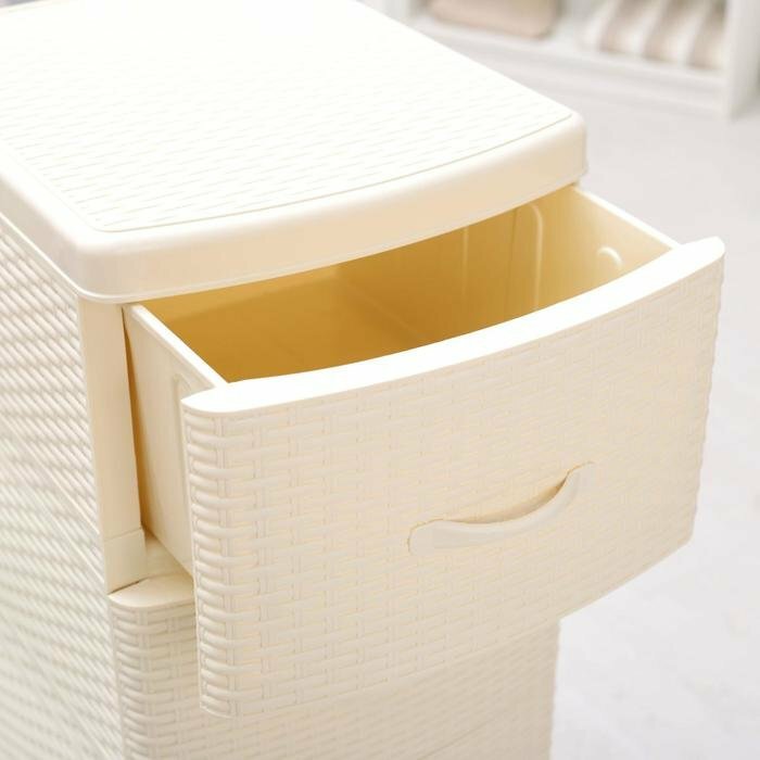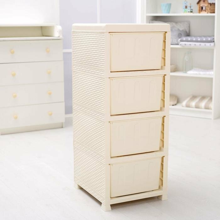 Комод пластиковый Ротанг с 4 ящиками / универсальный стеллаж для хранения вещей / органайзер для аксессуаров, цвет слоновая кость