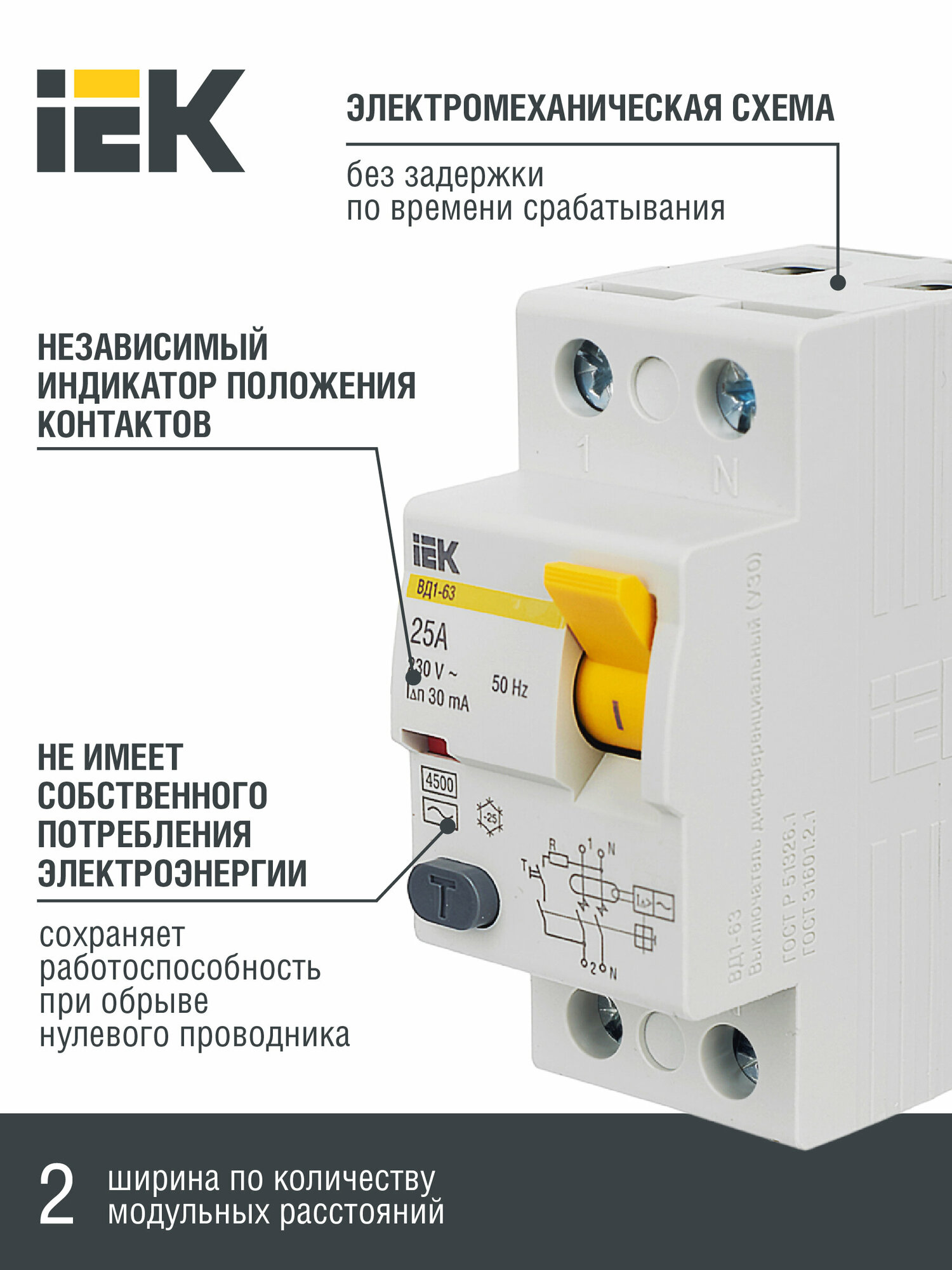 Выключатель дифференциальный (УЗО) IEK ВД1-63 2Р, 25А, 30мА, тип AC