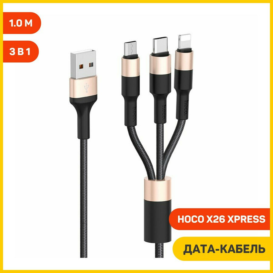 Дата-кабель Hoco X26 Xpress (3 в 1) USB-MicroUSB/Lightning/Type-C, 1 м, черный с золотом