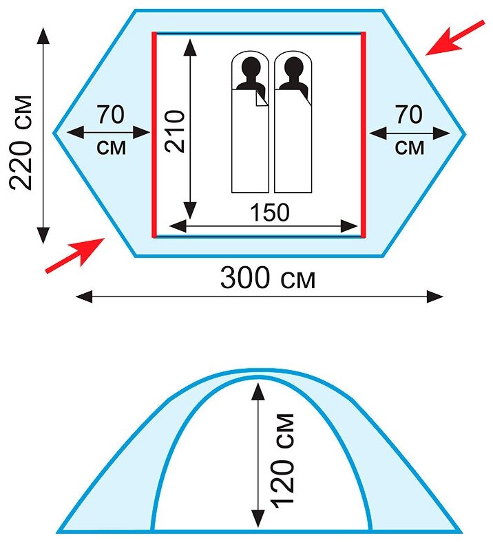 Два тамбура позволяют в один скинуть рюкзаки, а через второй свободно выходить из палатки. Юбка на внешнем тенте позволяет засыпать снегом или придавить чем-либо для большего комфорта и тепла. Проверена ливнями и непогодой горной части России. |