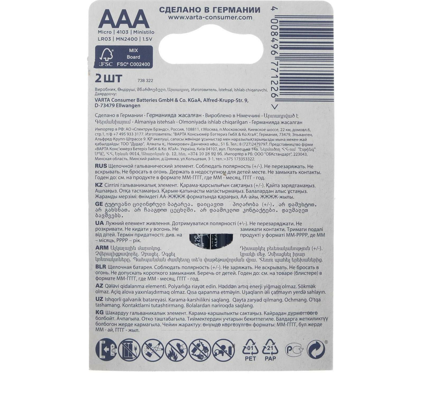VARTA 04103213412 Набор батареек алкалиновых VARTA ENERGY AAА LR03, 1,5В, упаковка 2 шт