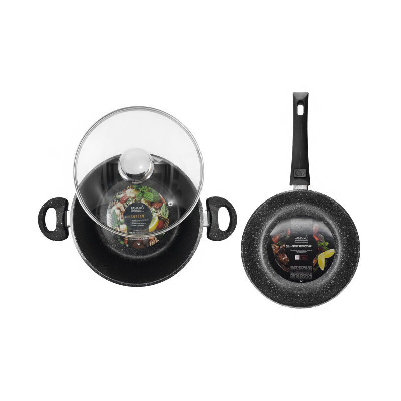 Набор посуды PANAIRO «Lordom" №1 из 3-х предметов Комплектация: 1.Сковорода глубокая 24см PANAIRO «Lordom" cо съемной ручкой soft-touch 2.Кастрюля 4л PANAIRO «Lordom" 3.Крышка
