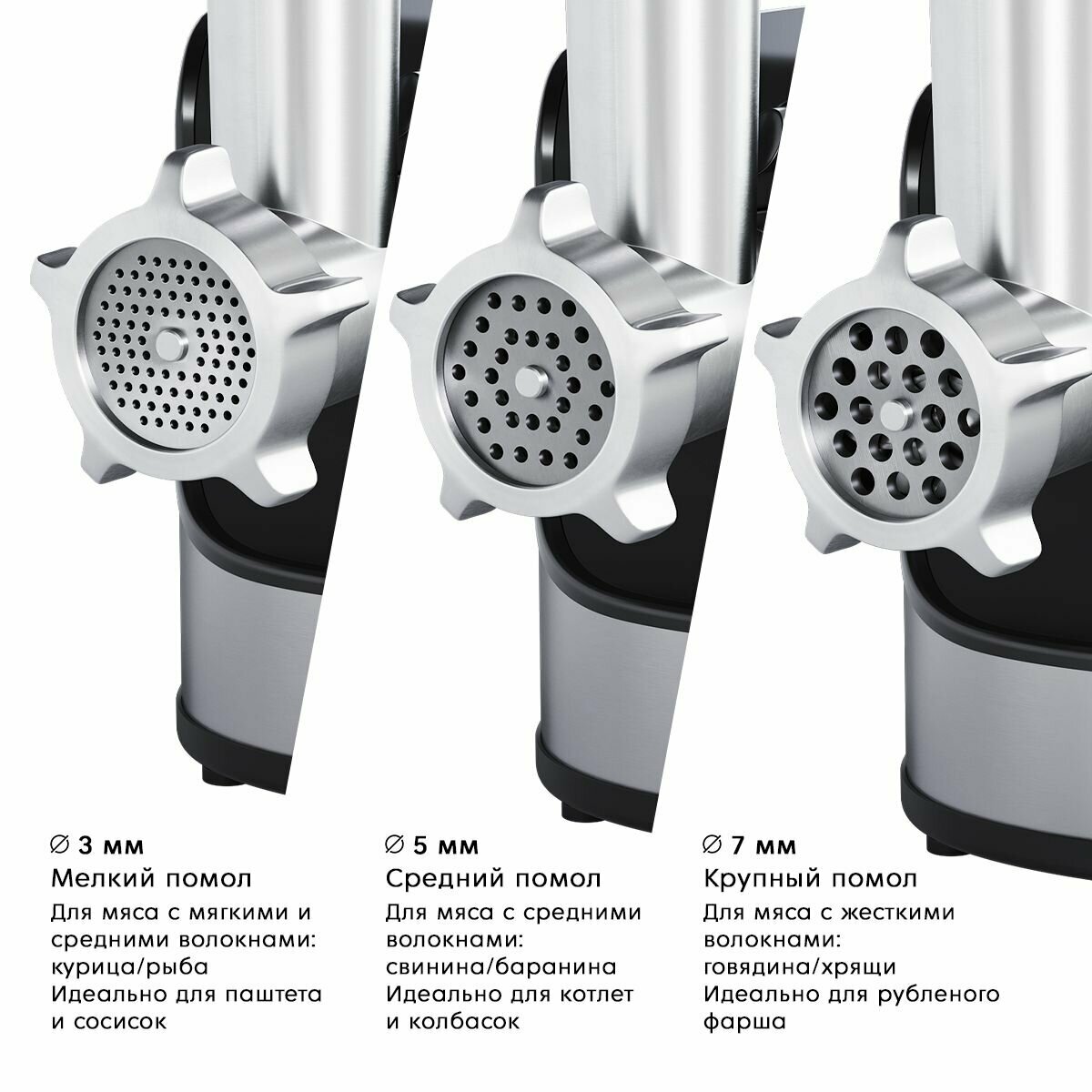 Есть несколько насадок. Чаще пользуюсь с самыми мелкими отверстиями. Фарш очень нежный получается. Работает стабильно. Внешне симпатичная. Пользоваться ей довольно легко - 2 скорости и функция риверса.