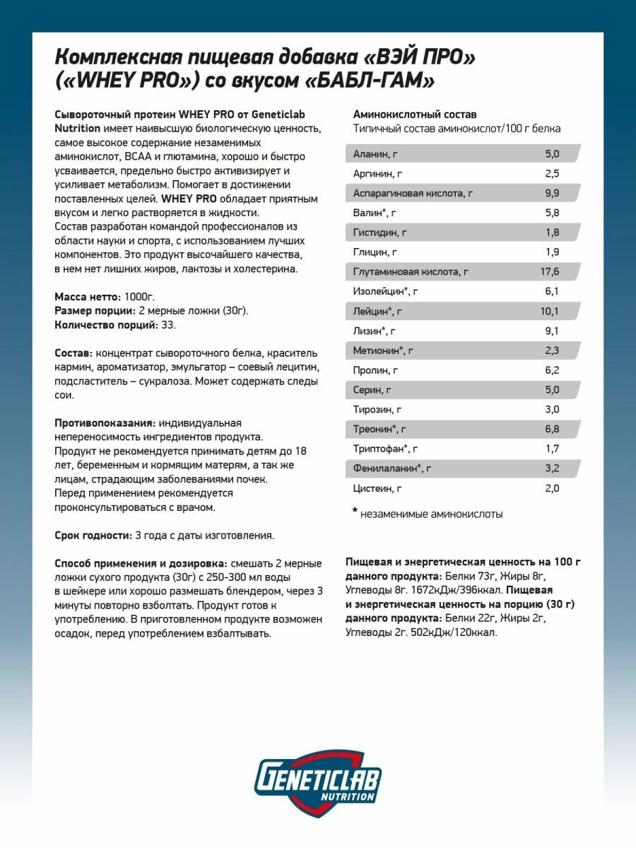 Протеин GeneticLab WHEY PRO, сывороточный, без вкуса, 100%, 1 кг
