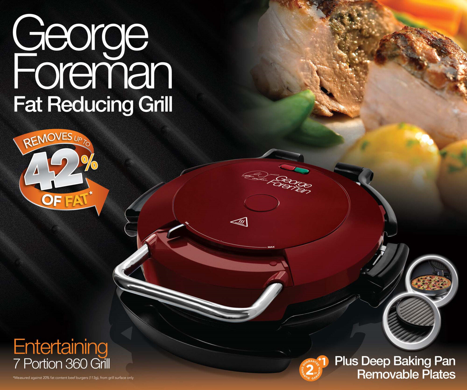 Гриль электрический 360 George Foreman 24640-56 красный, круглый, на 7 порций, 1750Вт, с глубоким поддоном для запекания, съемные панели, регулировка температурного режима