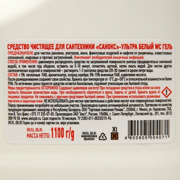 Гель WC для чистки унитазов санокс ультра Белый и других сантехнических изделий 1100мл 4600905004071