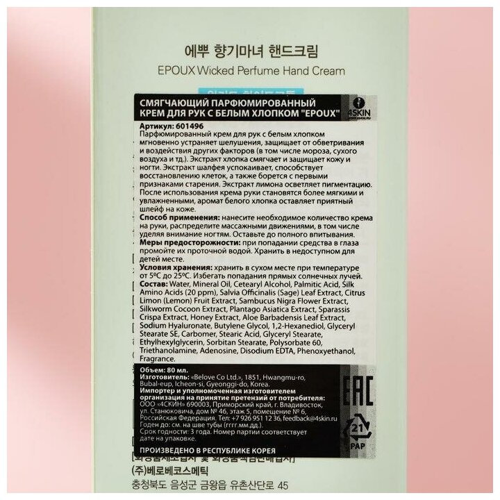 Крем для рук Epoux wicked white cotton смягчающий с белым хлопком 80 мл