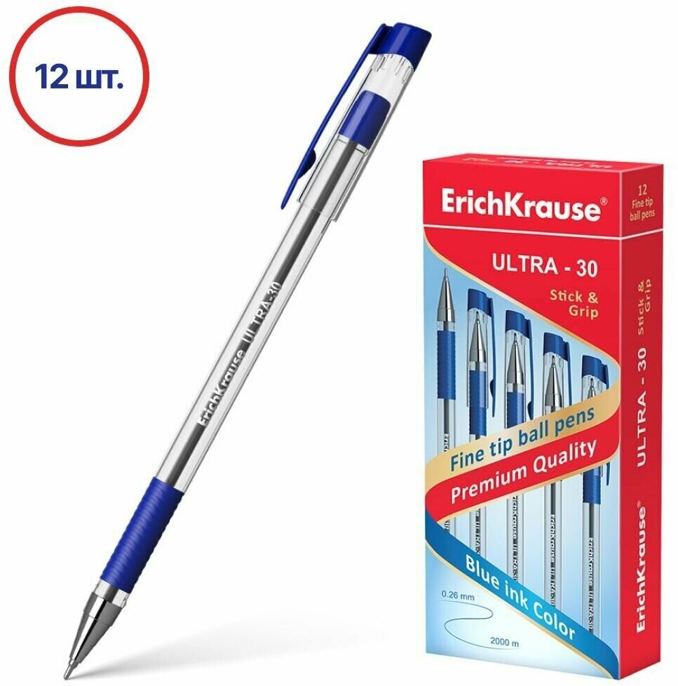 Купить Набор 12 штук - Ручка шариковая масляная с грипом ERICH KRAUSE "Ultra-30", синяя, корпус прозрачный, узел 0,7 мм, линия письма 0,26 мм,