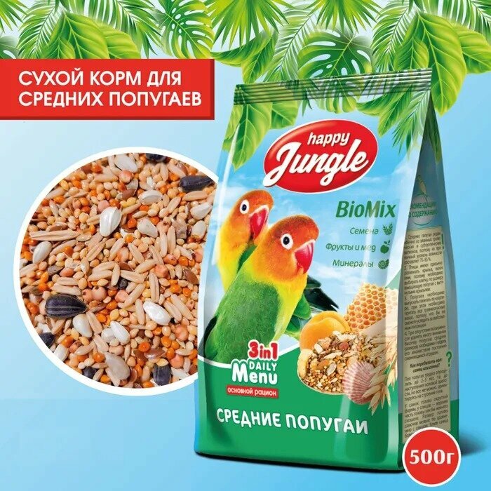 Корм для птиц HAPPY JUNGLE для средних попугаев 500г