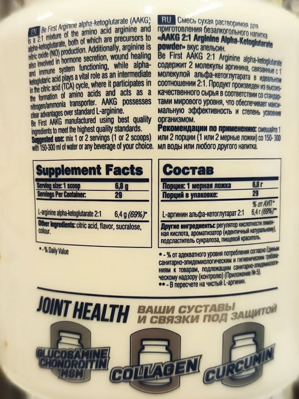 AAKG Be First Arginine AKG 2:1 (AAKG) powder (аргинин альфа-кетоглутарат) 200 г, Апельсин