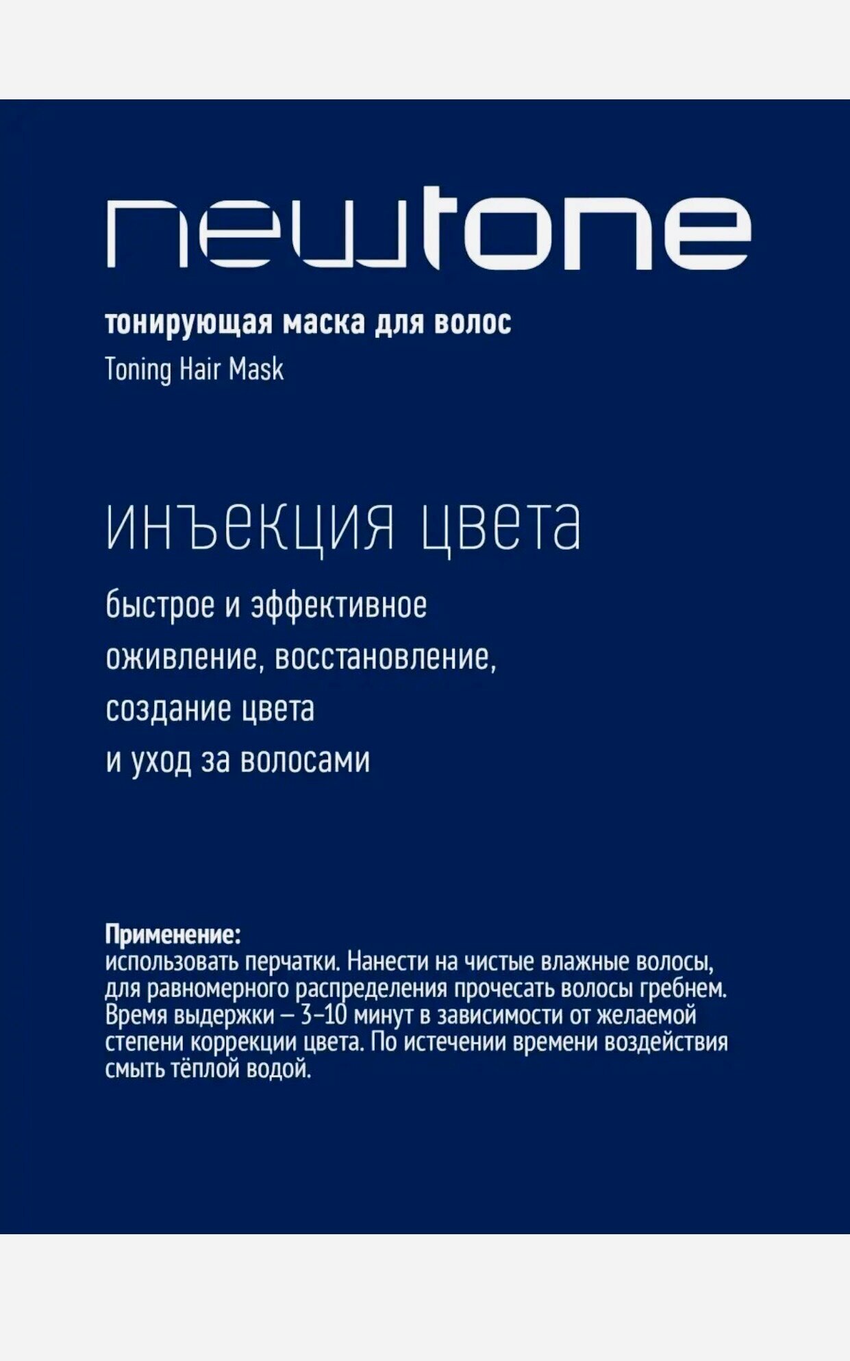 | Способ применения | Перед нанесением тонирующей маски Estel NewTone рекомендуется надеть перчатки. Наносите тонирующую маску Estel NewTone на чистые и влажные волосы. Чтобы маска равномерно распределилась по волосам воспользуйтесь расческой. Помните: чем больше время выдержки, тем насыщеннее получится оттенок! Подождите от 3 до 10 минут в зависимости от степени насыщенности цвета. Смывайте маску теплой водой БЕЗ использования шампуня. |
